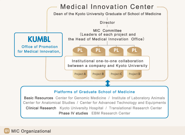 At the MIC we carry out the one-to-one institutional collaboration of drug discovery and development with a company in specific disease area(s). Under such collaboration, each project can utilize clinical samples of Kyoto University's Center for Anatomical Studies, carry out genomic analysis in collaboration with the Center for Genomic Medicine, and even conduct exploratory clinical trials at the Translational Research Center of Kyoto University Hospital. The Office of Promotion for Medical Innovation at the Kyoto University Medical Science and Business Liaison Organization (KUMBL) coordinates the MIC projects on demand by pharmaceutical companies (Figure 1).
