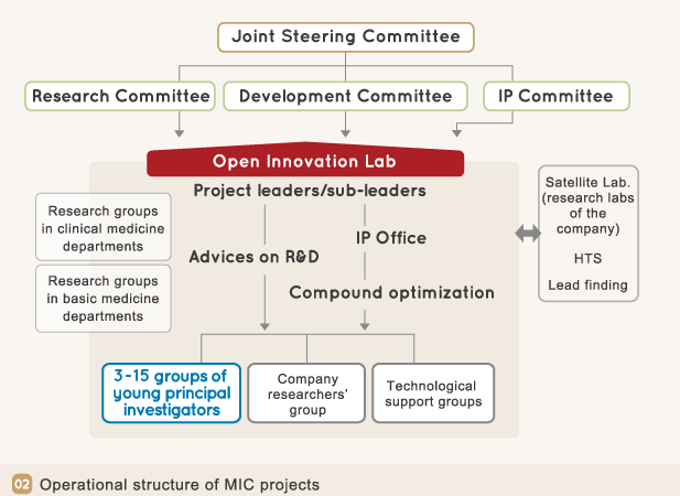 This MIC system conducts drug discovery efficiently through smooth cooperation between the university and the company from target finding to exploratory clinical trials. We welcome any proposal from any pharmaceutical companies on new areas.